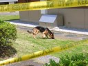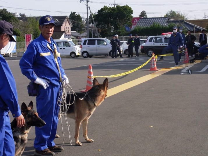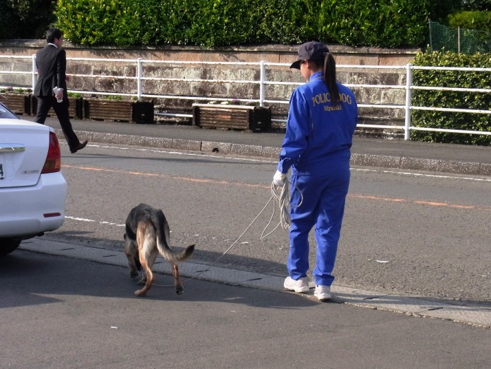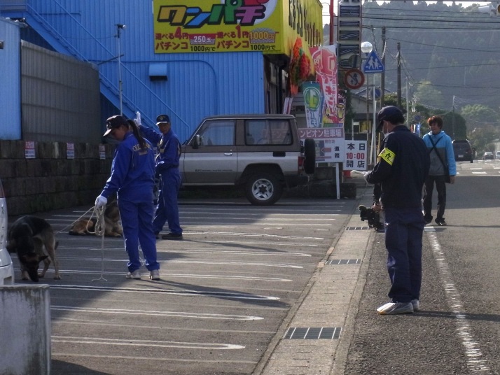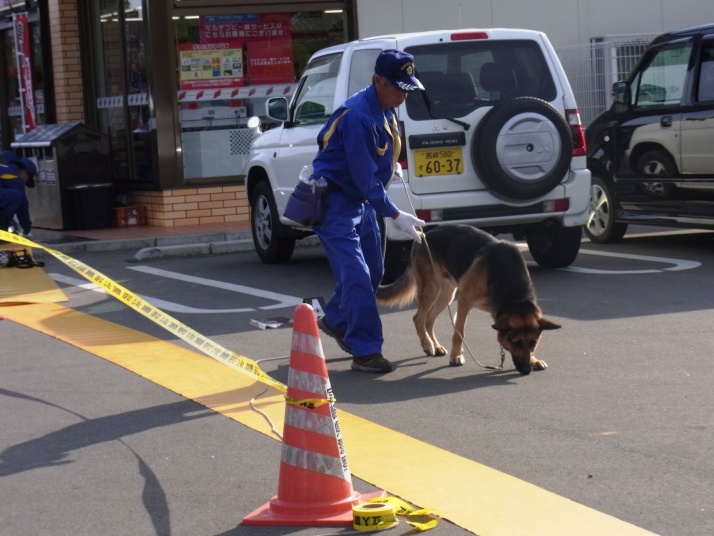 11月29日(月)宮崎北署、南署、高岡署の合同訓練が行われ、高岡所管内のコンビニ店に二人組の強盗が入り逃走した、という設定で当訓練所より2頭の嘱託警察犬が出動しました。