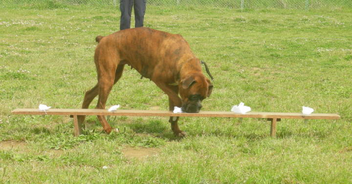 ボクサーのアポです。5人の匂いのついた布から先に匂った犯人役の匂い1つを嗅ぎ分け選びます。