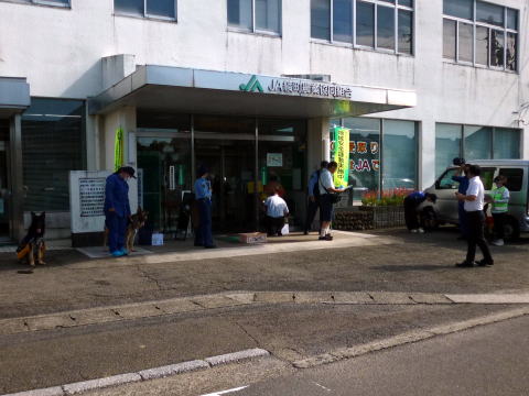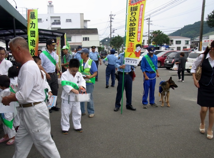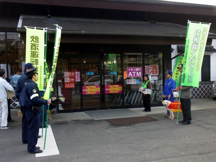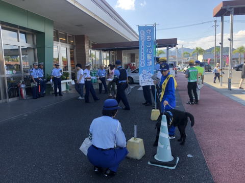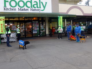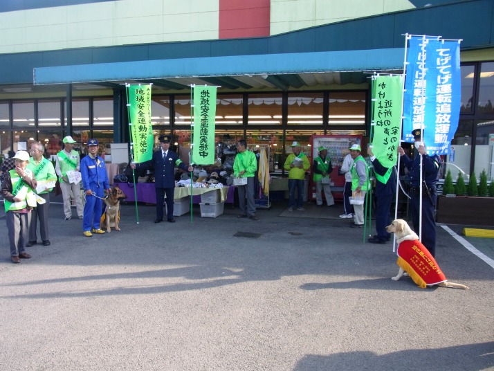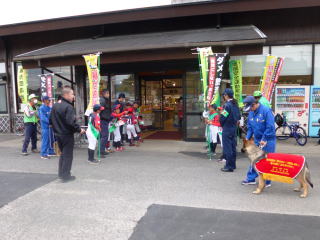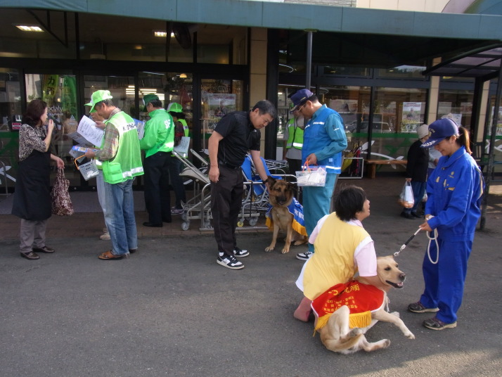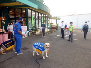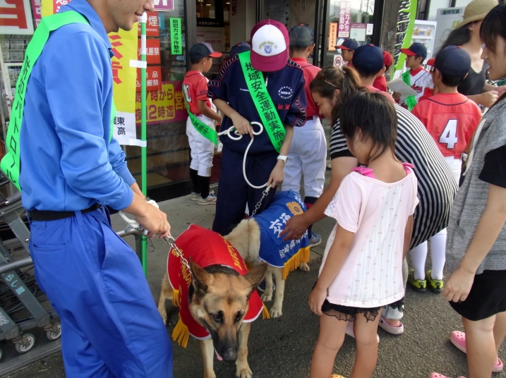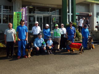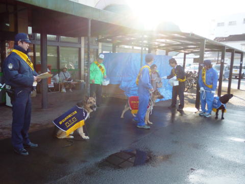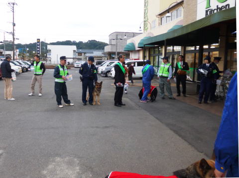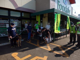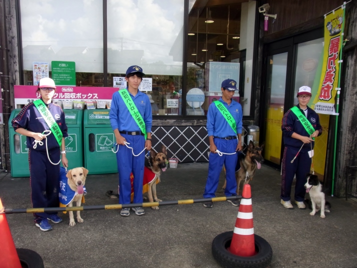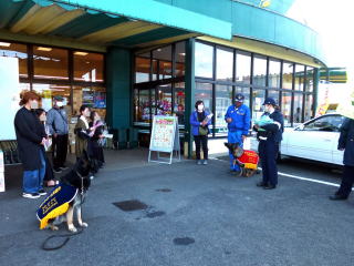 | 全国地域安全運動に伴う防犯キャンペーンが行われ、当訓練所警察犬もPRのため3カ所の店頭で広報活動に参加しました。 |