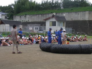 迫力ある訓練の様子に児童たちも興味津々で見入っていました。