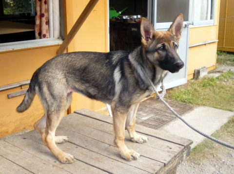 元気いっぱいで、つい手に噛みついてしまうのが今の課題です。凛々しい活発さを活かしつつ、おとなしく人の指示を聞けるよう、基礎からしっかりしつけ訓練に励みます。 |