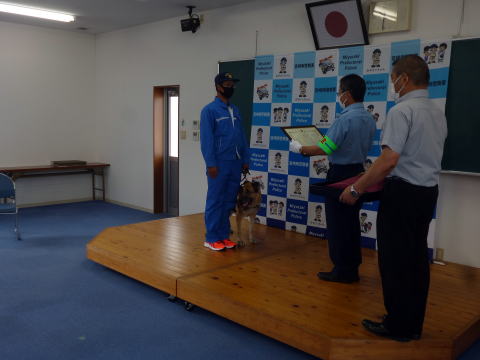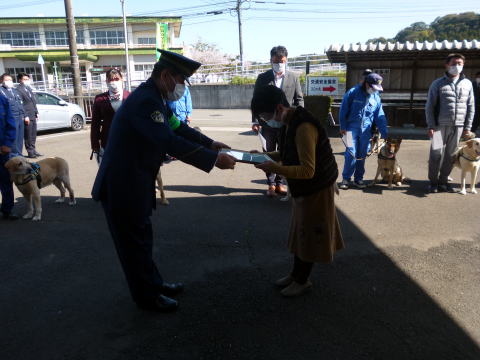 4月2日(火) 平成25年度警察犬の嘱託書の交付式が高岡警察署2階講堂にて行われ、嘱託書が署長より授与されました。